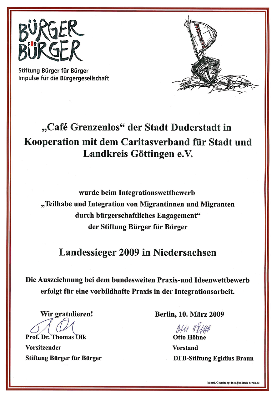 Als Landessieger für Niedersachsen wurde das Integrationsprojekt Café Grenzenlos mit Urkunde und Blumen beglückwünscht. Etliche freudestrahlende Frauen waren der Einladung in die Hauptstadt gefolgt, um an diesem feierlichen Anlass teilzunehmen. Gestärkt durch diese Anerkennung und mit vielen neuen Anregungen kehrten die Frauen aus Berlin ins heimische Duderstadt zurück.